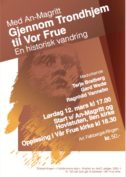 Jeg hadde håpet Falkberget-Ringen skulle greie å få etablert et fast palmesøndagsopplegg i Trondheim med samarbeidspartnere. I det store An-Magritt-året i 2009 da vi hadde så mange ulike programmer i Trondheim, var det ett i Vår Frue kirke med opplesning og foredrag. I mars 2011, etter at Jon og jeg hadde mottatt Videnskabsselskabets minnemedalje i gull for kulturarbeidet vårt med Falkberget, arrangerte vi ei kulturvandring: ”Gjennom Trondhjem til Vor Frue”. Den startet ved Ilen kirke og endte i Vår Frue med opplesning og sang. Særlig dette med at Pedros sang så vakkert at han fikk jobb som vikar i kirka litt lenger ut i romanverket, inspirerte meg til sammen med de ansatte og frivillige i Vår Frue å finne en ung gutt som kunne synge.