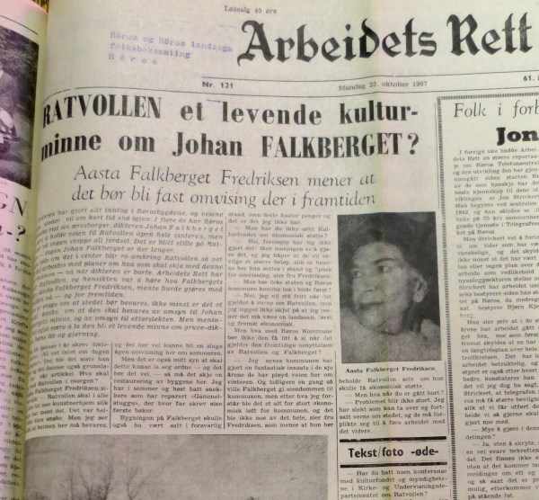 Hva skal skje med Ratvollen i morgen? De intervjuet Aasta Falkberget Fredriksen. ”Ratvollen skulle ikke bli noe dikterhjem, det var også fars ønske, sa hun. ”… ”heimen her må bevares, og det bør vel kunne bli en slags omvisning her om sommeren.” – Men det trengs restaurering av byggene. Hun har allerede hatt snekkere i gang i ”Gammelstuggu”. Bygningene på selve Falkberget burde også vært satt i forsvarlig stand, men det koster. Journalisten spør både om å søke Kulturfondet, og om ikke stat og kommune bør inn. ”Nei, jeg vil stå fritt når det gjelder å verne om Ratvollen, men jeg legger ikke skjul på at jeg mener det må være en landssak, først og fremst økonomisk”, sier Aasta. ”Men hva med Røros Kommune bør ikke den få litt å si når det gjelder den fremtidige benyttelsen av Ratvollen og Falkberget?”, spør journalisten (…)Aasta forteller ”… Og tidligere en gang så ville Falkberget gi eiendommen til kommunen, men etter hva jeg forstår ble det et alt for stort økonomisk løft for kommunen, og det ble ikke noe av det hele.”