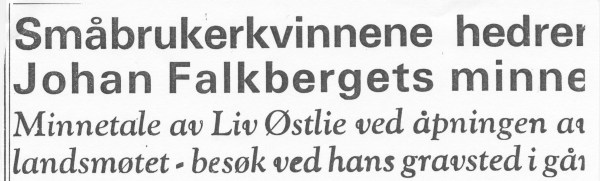 I tankene deltok vi i Johan Falkbergets gravferd da vi utsatte vårt landsmøte. Når det ikke lyktes oss å gi ham en blomst mens han levde, vil småbrukerkvinnenes landsmøte i morgen samles ved hans siste hvilested for å bringe dem dit med en siste hilsen og takk for alle de evighetsblomster han sådde langs sin bergmannssti.