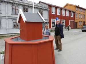 Jeg var en tur inn til Røros i dag. På vei til å dra igjen, kom jeg på at jeg måtte bort i Storgata (Bergmannsgata) for å se hvordan vannposten var blitt. – Kanskje litt dominerende? Og kanskje må det til noen piler i gata? Biler kjørte både til høyre og venstre for den. Akkurat det går seg nok til etter hvert.