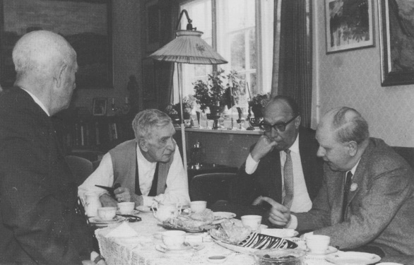 Jeg trodde ikke jeg hadde hørt om det før, men i Jul i Fjellheimen for 2014 sto det en artikkel om Ole J. Kværneng med en rekke bilder fra hans album. Kværneng var ordfører i Røros i 16 år fra 1952, fra 1964 i den sammenslåtte storkommunen Røros. Et av bildene, det som er vist under, har denne teksten: “Møte på Ratvolden – Johan Falkberget, fylkesmann Skrindo, ekspedisjonssjef Leif Wilhelmsen og meg. Vedrørende Falkbergets tilbud til Røros kommune om overtakelse av Ratvolden og Falkberget!”