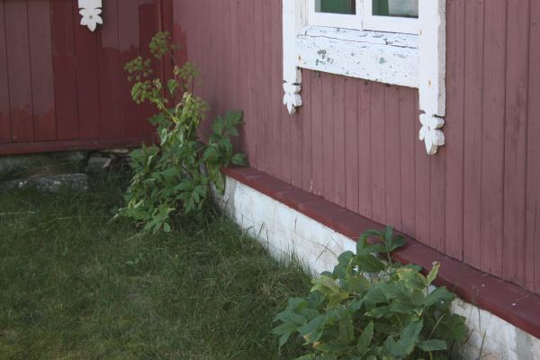 Og så er det alle de andre husene som tydelig viser at arbeidet er nesten uendelig framover. Jeg har vært svært selektiv i mine valg av motiver når jeg har tatt bilder som jeg har brukt i formidlingen. Jeg har ikke villet fokusere på hvordan det egentlig står til. Her er bare et par eksempler som viser hva som står for tur når det gjelder maling av de husene som de fleste ser når de kommer ned på tunet; gammelstuggu og driftsbygningen.
