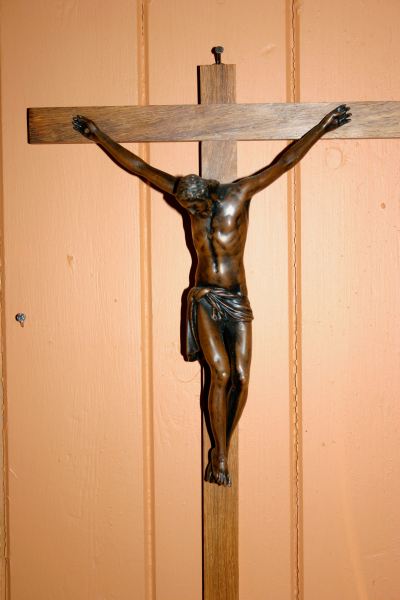 Det henger krusifiks både nede på skriverloftet på Falkberget og i museet på Ratvolden.