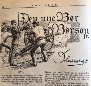 «Da jeg i min studietid måtte reise til Oslo hver dag, var jeg som regel sammen med Johan Falkberget. Jeg følte meg meget beæret når jeg kunne få gå med ham til Dampkjøkkenet hvor kaffekoppen den gang kostet 10 øre. Der møtte vi redaktør Hans Østerholt og tegneren Jens R. Nilsen. Det var i den tid Falkberget skrev «Bør Børson» og senere også «Simen Mustrøen» for «Hvepsen». Jeg fikk høre diskusjoner om hva neste kapittel skulle inneholde, og var en ivrig lytter uten selv å bidra noe til idédiskusjonene. Men interessant var det, og jeg lærte meget.» (Min kommentar: det var «Simen Mustrøen» som var først.)