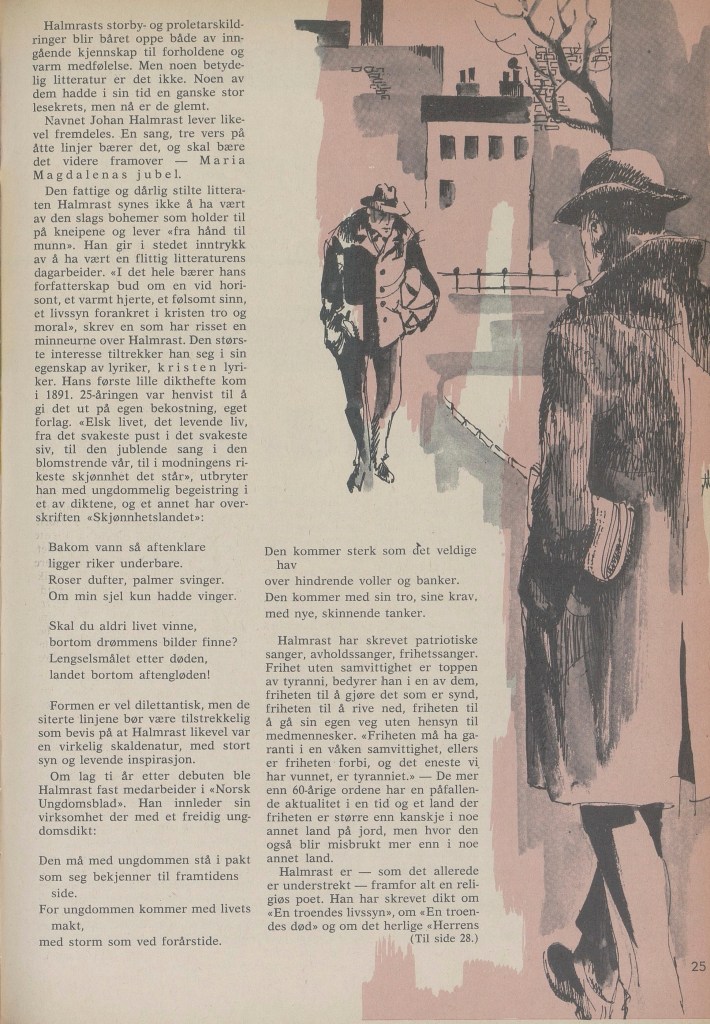 I artikkelen «Maria Magdalenas Jubel» i Krigsropet i 1968, skriver de litt mer fra Falkbergets artikkel i Kirkeklokken, om møtet med Halmrast: «Defekte skuldre, langt ansikt, nærmest liten, lange ben, kledd i svart, slitt dress. Han bar på en bylt …»